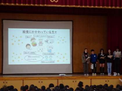 給食委員会の発表を聞いて、給食には、給食調理員さんだけではなく、農家の人や食材を運んでくれる人、栄養教諭の先生や給食当番など、たくさんの人が関わっていることが分かりました。