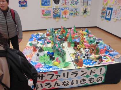 自分の好きな動物をそれぞれが紙粘土で作り、10校の友達の作品と合体させて「ひろがれサファリランド!いろんないきもの」が出来上がりました。