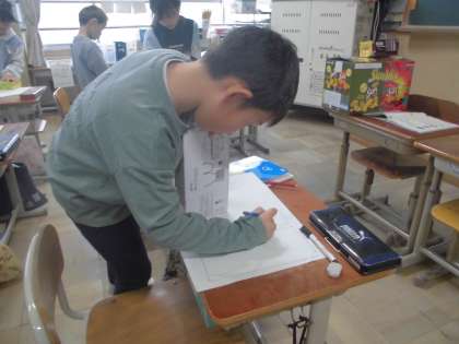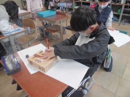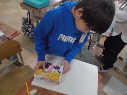 算数科は『はこの形』という単元に入っていきます。箱の準備にご協力いただき、ありがとうございました。さっそく、用意していただいた箱を使った授業をしました。箱の形を紙に写し取りながら、気付いたことを全体で共有しました。「(前に学習した)長方形・正方形がある」「面の数は6つある」「直角があるよ」これまでに学習したことを思い出しながら、箱の形の特徴について整理していきます。