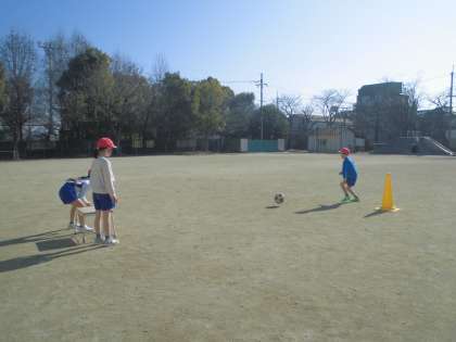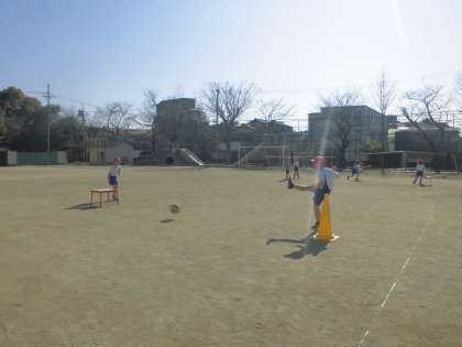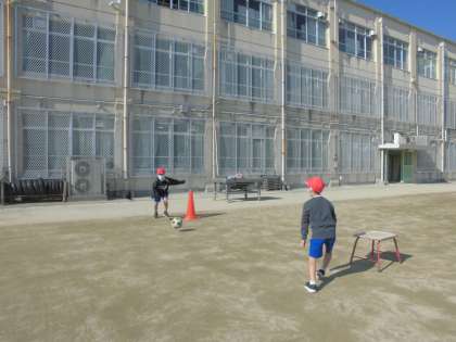 体育科は『キックベース』に入っています。本格的には3年生になってから行いますが、ルールも難しいので、少し2年生のうちに触れておきたいと思い、取り組んでいます。今日は「遠くに蹴る」をめあてに練習をしてみました。助走をつける、ボールの下目を蹴る、足を思い切り振るなど、子どもたちの気付きから練習の質が上がっているように見えました。試合ができるようになるまで、練習を重ねていきます。