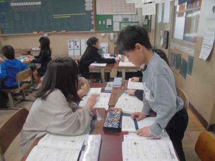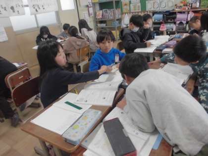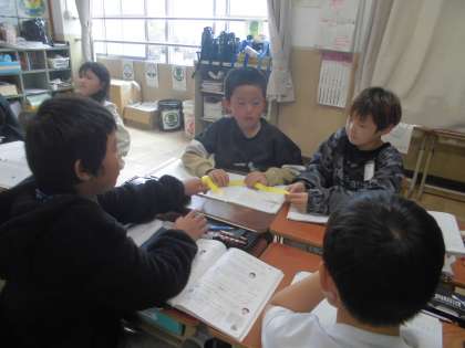 算数は『分数』の単元に入っています。今日は「もとの大きさの半分の半分の大きさ」について考えました。テープを折った時に、線3本で分けているから「3分の1」?それとも、同じ大きさの形が4つに分かれているから「4分の1」?グループの中で理由を考えて、全体で共有しました。では、そこからさらに半分に折った時の分数は?