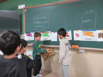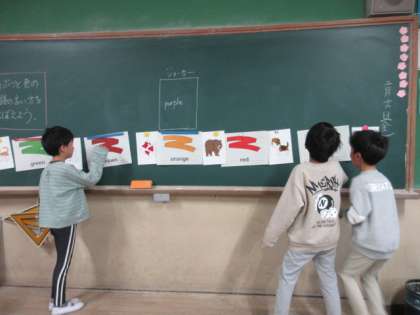 外国語活動で、動物や色の言い方を学習しています。単元の2時間目である今日は、クラスを2チームに分けて、どんじゃんけん形式で動物と色のカードを言いながらゲームをしました。分からないカードは、チーム内で教え合って、どんどん進めていきました。最後は自信をもって発音する様子が見られました。