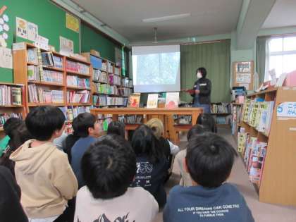 と池地先生。紹介された本をとても興味深く見入っていたみんなでした。いろいろな本に触れて、読書の幅を広めてほしいと思います。