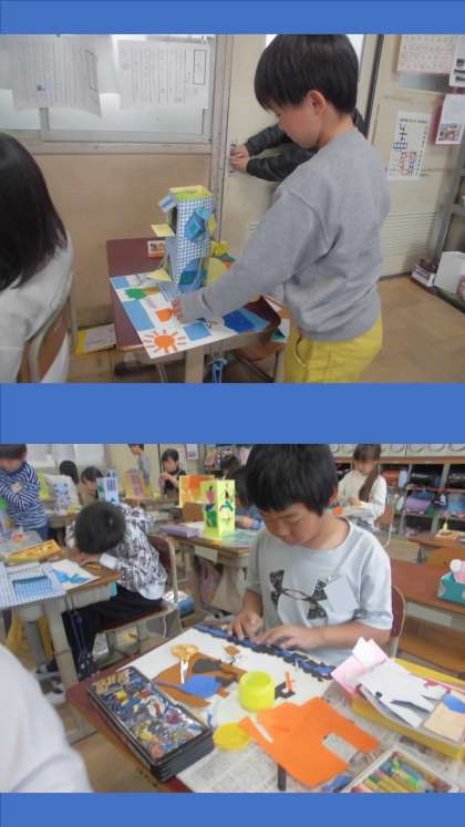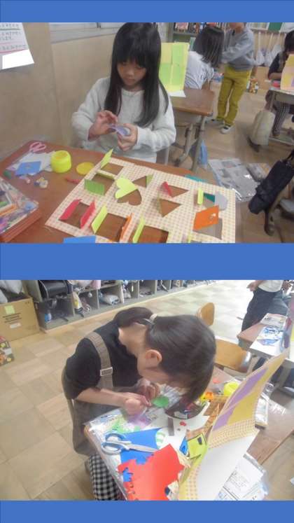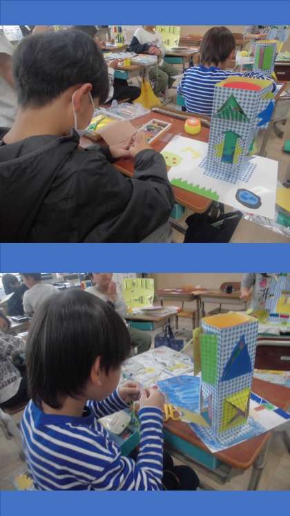 図画工作科『まどをひらいて』は、組み立て作業に入りました。マンション型とタワー型の画用紙を立てて、台紙の仕上げも行いました。カッターナイフで開いた窓からどんな絵が登場するか、楽しみながら見てほしいです!