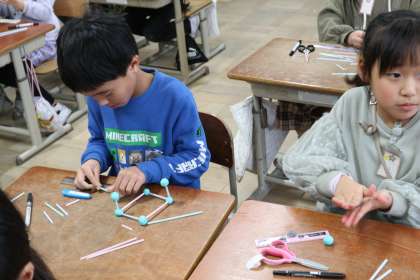 そして今回は、ひご(ストロー)と粘土玉を使って箱の形を作る学習をしました。