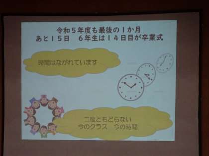 学校教育目標も再確認しました。今の自分はどこまで達成できているのか、残りの日々をどのように、何を大切にして過ごすのかを考えながら、一日一日を大事に過ごしていってほしいと思いました。