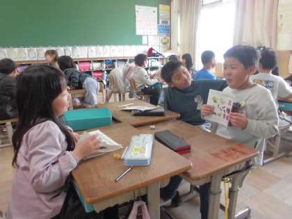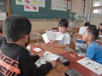 英語活動『絵本をしょうかいしよう』は、最後の絵本を紹介する時間に入りました。色と動物の単語を覚えた子どもたちは、「a」+「色」+「動物」のいろいろな組み合わせをスラスラと言えていました。3年生になると、外国語活動が始まるので、その時まで覚えておいてほしいです。