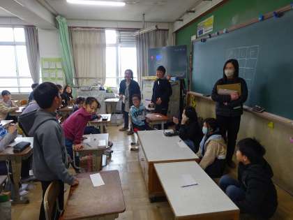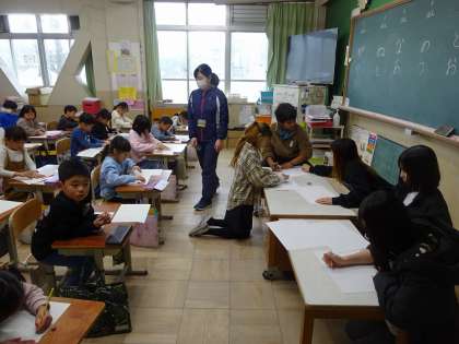 「ひらがな上手に書けるかな対決」や「絵伝言対決」、「日本の歴史早押し対決」や「豆つまみ対決」などがありました。勝負の行方も気になりますが、それ以上に対決を通して、6年生と楽しく交流する姿が多く見られて良かったです。