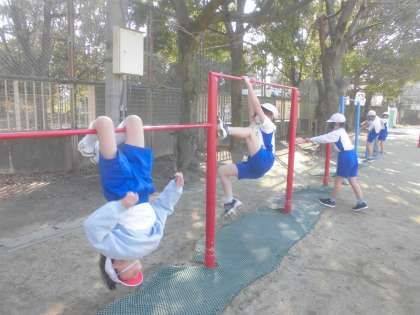 鉄棒の技がのったビンゴカードを手に、さまざまな技に挑戦しています。