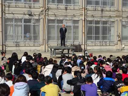 続けて始業式を行いました。校長先生からは、「自分も他人も穏やかに過ごせるようにしていってほしい。そのためには、この1年間をどのように過ごすのかを考えてほしい。」「精いっぱい挑戦した、頑張ったと言えることを増やしていきましょう。そして、みんなで主体的に学校を創っていこう」というお話がありました。