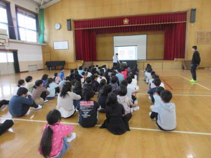 5年生の学年集会を開きました。3名の担任紹介と専科の先生の紹介、5年生の学年目標について話をしました。
