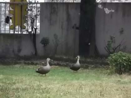 カルガモの夫婦が仲良く川岡東小学校にやって来ました。毎年この時期に訪れるとのことです・・・。子どもたちにも大人気です。
