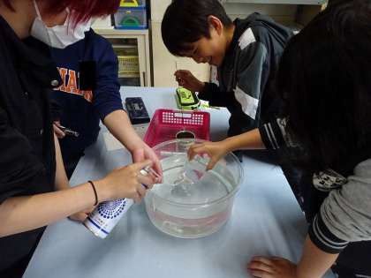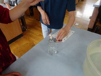 安全に気をつけながら、班の友達と協力しながら実験を進めました。それぞれの気体の燃え方の違いが分かり、子ども達もびっくりしていました。