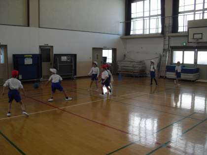 3年生の最近の体育は「エンドボール」をしています。エンドボールはボールをパスをつないで、ゴール役のゴールマンにボールをとどける、バスケットボールと似たゲームです。相手をよく見て、せめるときはボールを取られないとようにパス!守るときも相手をよく見てパスカット!チームで協力して、うまくいったらみんなで喜び合う姿が素敵でした。