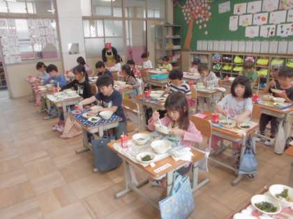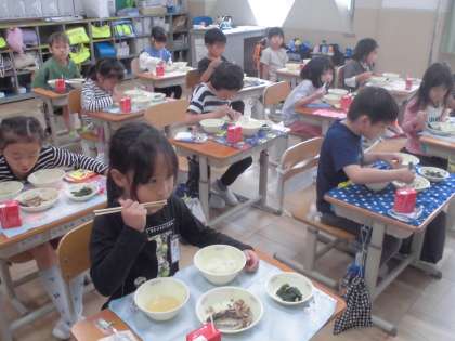 「今日はさんまー。」と喜ぶ声と、「骨がいっぱいあるんやろー。」と心配する声が飛び交う給食の準備中。