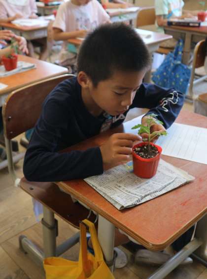 今日は、植木鉢に植え替える前にミニトマトの苗を観察しました。