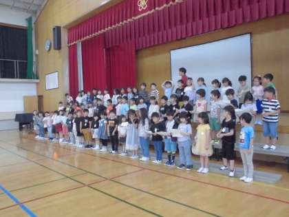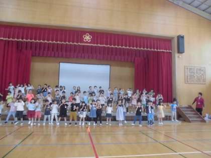 金曜日にある1年生を迎える会にむけて体育館で言葉やダンスの練習をしました。