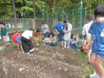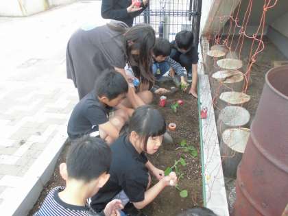 4年生の学習でヒョウタンを育てています。芽が出て少し大きくなったので学校園に植え替えをしました。