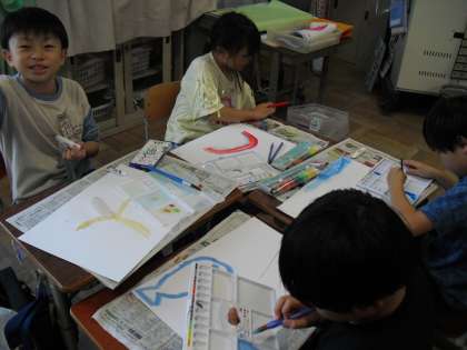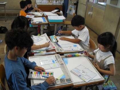 図画工作科では、水彩絵の具を使って絵をかいています。赤と青を混ぜると何色になるだろう?青と黄色は?緑と白は?いろんな色の組み合わせを考えて、自分のすきな色を見つけました。