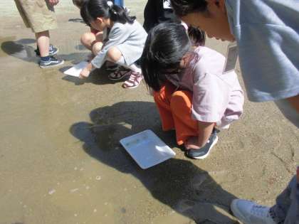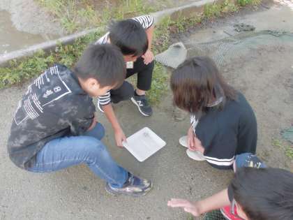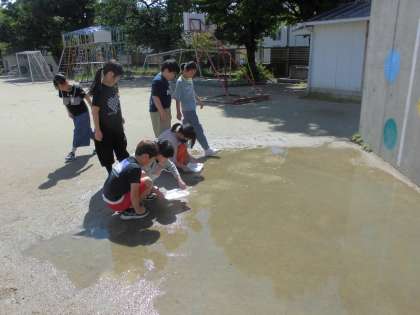 ということで雨はあがりましたが、水たまりが残っていたので水の流れと地面の傾きを調べに行きました。