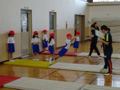 体育館では、長座体前屈・反復横跳び・立ち幅跳び・上体起こし・20mシャトルラン・握力などを行います。学年によって実施する種目は異なりますが、自分のベストを尽くしてチャレンジしてほしいと思っています。