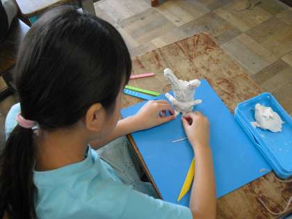 今週は粘土を使った作品作りに取り組んでいます。今回は粘土をこねてまるめて手で形をつくるだけでなく、用具も活用していきます。へらやひもを使って粘土を切ったり、あなをあけたり、模様を作ったりして、面白い形を探していきました。