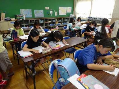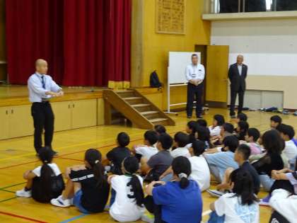 始まる前に、昼休みに体育館で開講式を行いました。「めあてをもって学習に取り組む」「あいさつをする」「話を最後まできちんと聞く」「言葉遣いに気をつける」など、放課後まなび教室での約束事について話がありました。