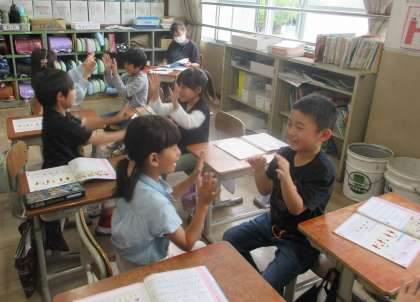 友達と手を合わせたり、ひざを打ったりしながらリズム遊びを楽しみました。