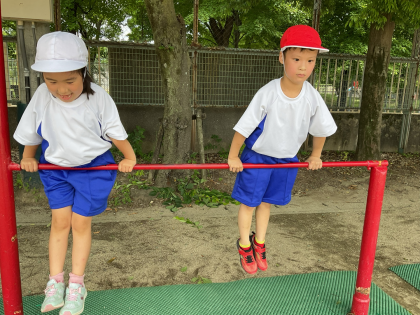 てつぼうでは、棒の握り方やルールに注意しながら、