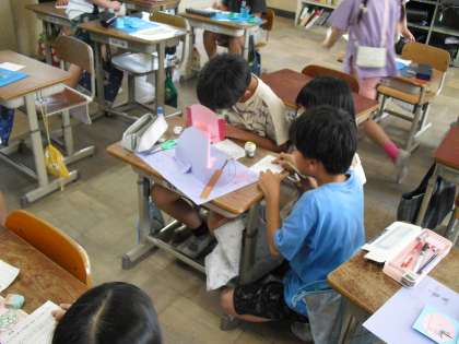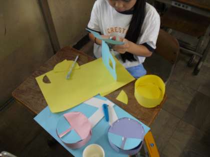 先週から図画工作科では、わりピンを使って動いたり回ったりする作品制作をしています。今週は作品の仕上げと友達の作品の鑑賞です。特に作品の鑑賞では、友達の作品を動かしてみて、どんな工夫をしているか、お互いに楽しみあっている様子でした。今日「いいな。」と思った友達のアイデアは別の工作の時にも生かしていきましょう!