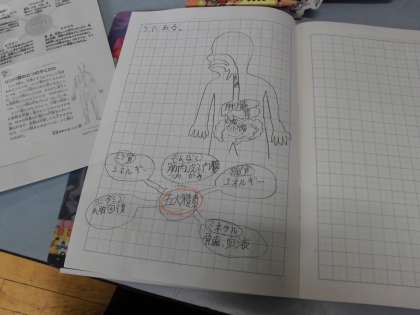 理科で「ヒトや動物の体」の学習をしています。自分で調べたい内容を決め、調べてノートにまとめました。絵を描いたり表にまとめたりしている子もいました。