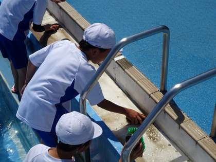 プールサイドを一生懸命こすったり、腰洗いそう付近もれいに掃除したりしてくれました。良い天気のもと、、楽しそうにこすりながらきれいにしてくれました。