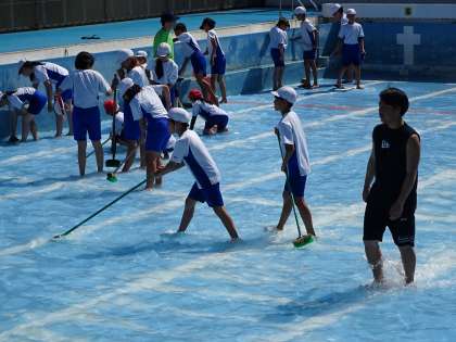 プールサイドの外側では、6年生以外の児童が見学に来ていました。6年生が掃除する姿を見て、こうやって見えないところで6年生は掃除をしてくれていたんやなぁと感じてくれたらと思いました。