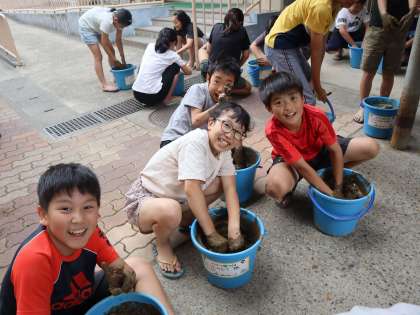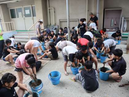 バケツに土を入れた後、水を入れて、土づくり。