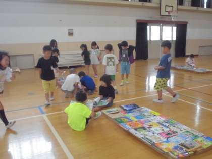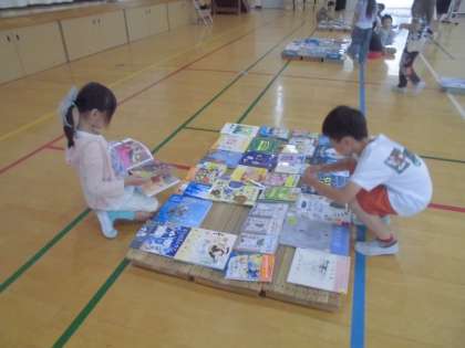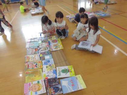 体育館にいーっぱい並べられた本を見て大興奮の子どもたちでした。