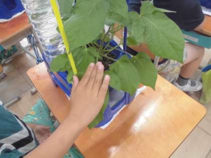 「前よりはっぱが大きくなった。」「葉っぱの数も増えた。」と、前との違いに気づいて観察カードに記録していました。