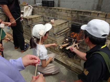 運動場の投てき板の後ろにあるかまどを使って火おこしをしました。参加した子ども達は、実際の焚火にドキドキしながらも楽しそうで、マシュマロをおいしそうに食べていました。