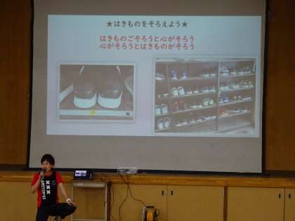 最後に、履物をそろえることについて話がありました。靴箱には、上靴や運動靴がきれいにそろえられているクラスが多いです。
