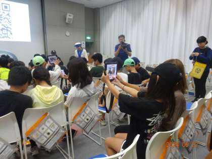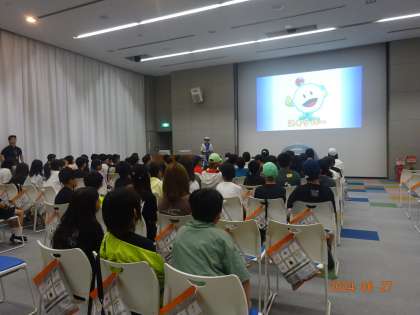 大阪ガス科学館の建物に入りました。オリエンテーションの様子です。ここでもスキッパーが登場です。スキッパーが科学館館内を案内してくれます。子どもたちもこれから館内を回ります。