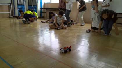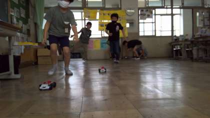 友だちと並列つなぎと直列つなぎのモーターカーでスピードを比べてみました。