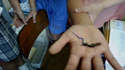 クラスにいる動物博士の子に聞くとニホントカゲだそう。このあと無事にもとの場所にかえしました。