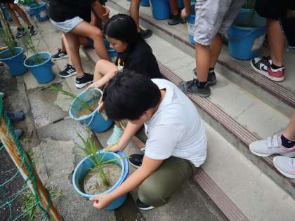 暑い日々に耐えながら、バケツ稲がすくすく育っています。