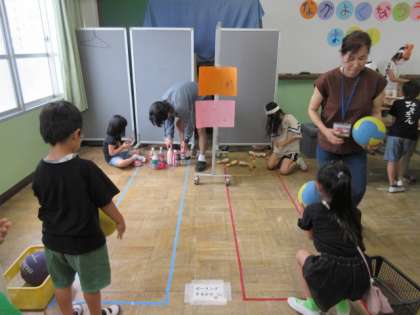 中間休みに、1年生をクラスごとに招待し、射的・魚釣り・ボーリングのコーナーをなかよし学級の子ども達が担当し、1年生に楽しんでもらっています。
