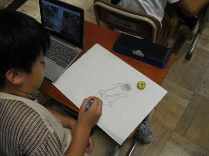 今年もお話の絵のコンクールの季節がやってきました。各クラスそれぞれ読み聞かせを聞いて、アイデアスケッチを進めています。難しいのは登場人物のポーズ。何をしているのかが伝わるように描くために、ポーズを工夫して描きました。具体的にポーズを描くために、友達にポーズをとってもらうなど、協力して描き進めていました。