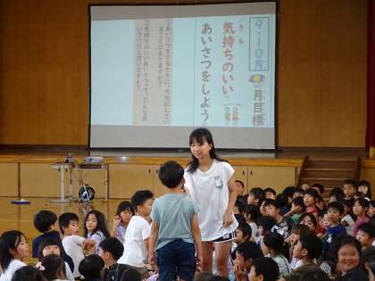9・10月の児童会月目標の発表もありました。9・10月の児童会月目標は、「気持ちの良いあいさつをしよう」でした。
