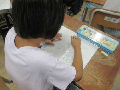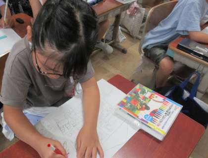 図工の学習では、本を読んで想像したことを絵に描く活動をしています。
