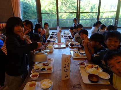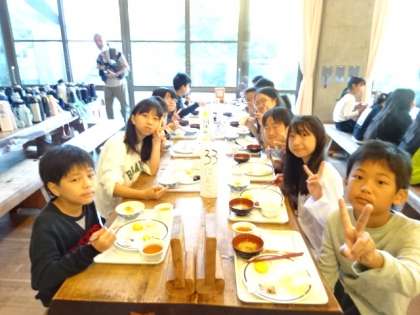 「朝からおなか減ってたし、おいしそう」「登山に向けてしっかり食べておこう」「家では朝ごはんはパンやけれど、今日はご飯にしたよ」など、友達とお話ししながら食べていました。