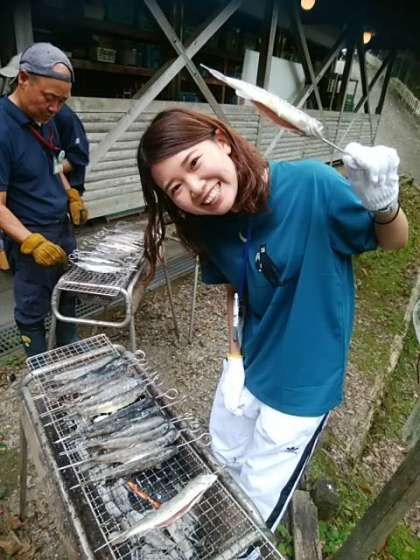 焼けた魚はこんな感じです。先生の笑顔が魚のおいしさを表現してくれています。