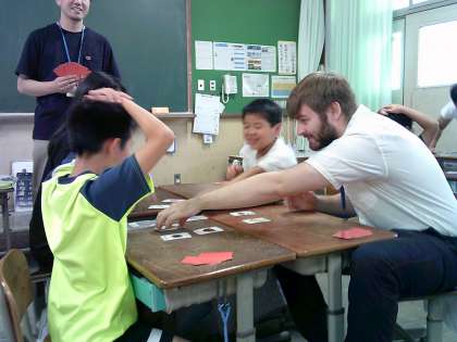ALTの先生と一緒に「What food do you like?」とたずねてカルタゲームをしました。