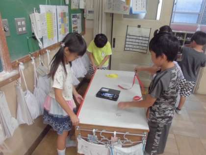 同じ長さに切ったテープを使って、「○○より○○の方が大きい」という言い方で、2つの物の長さを比べました。
